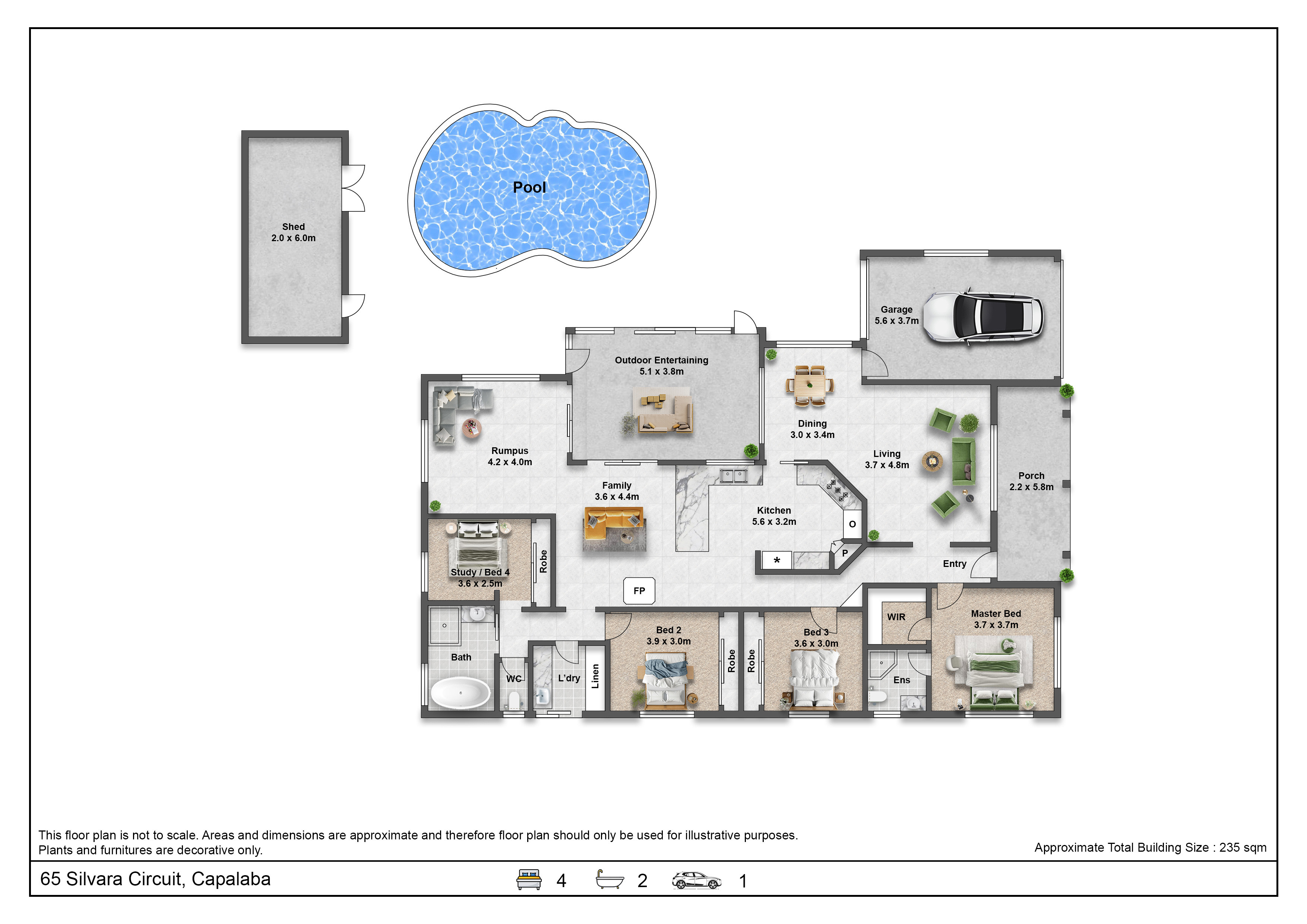 The master bedroom is complemented by a private ensuite and walk in robe, providing the ultimate parents retreat. The remaining three bedrooms are serviced by a modern family bathroom with floor to ceiling tiling, glass shower and a luxurious freestanding bath, located at the other end of the house.